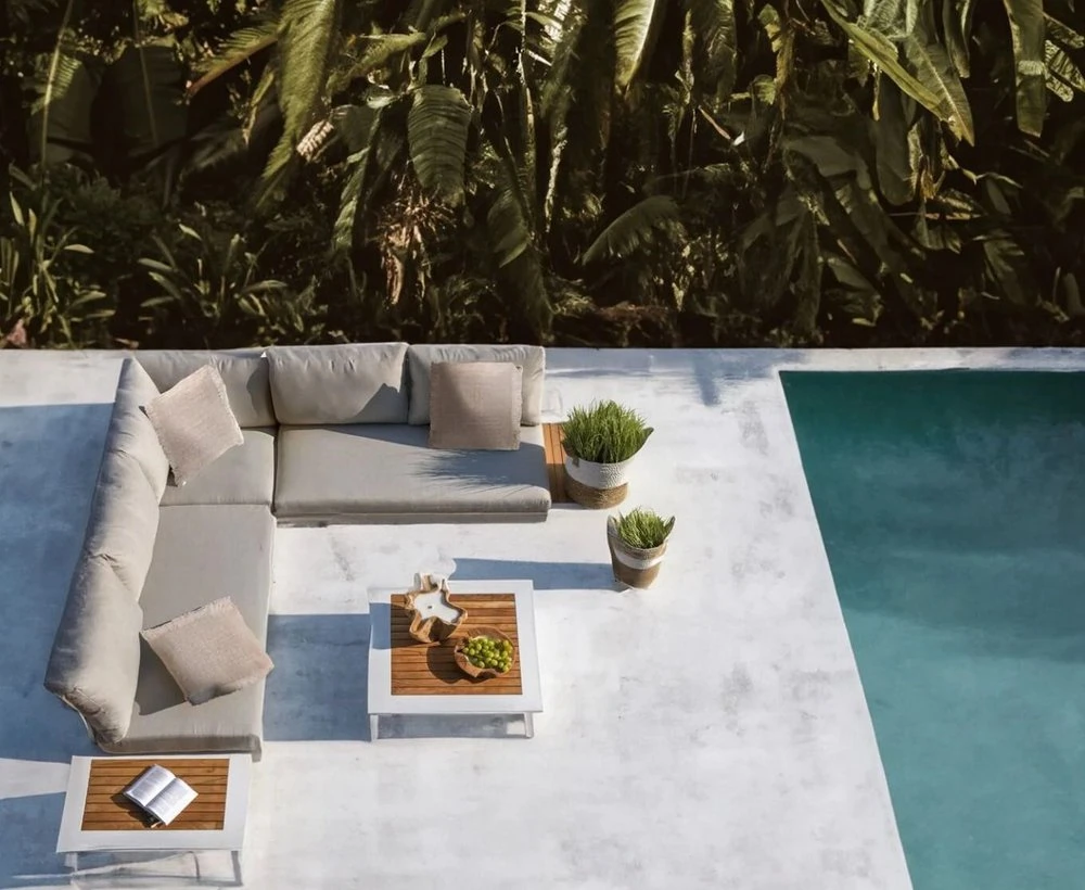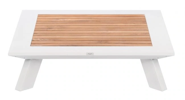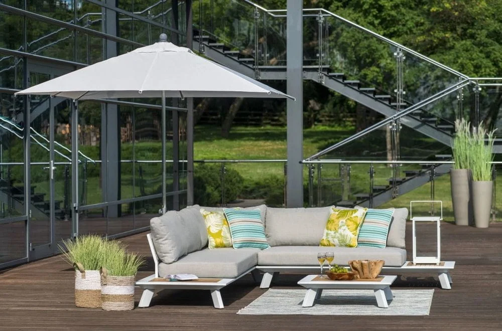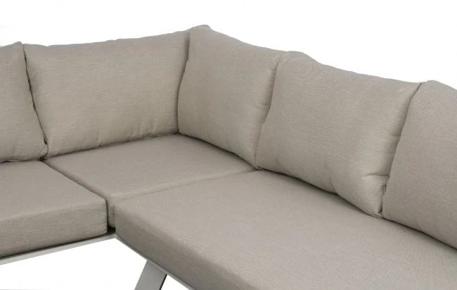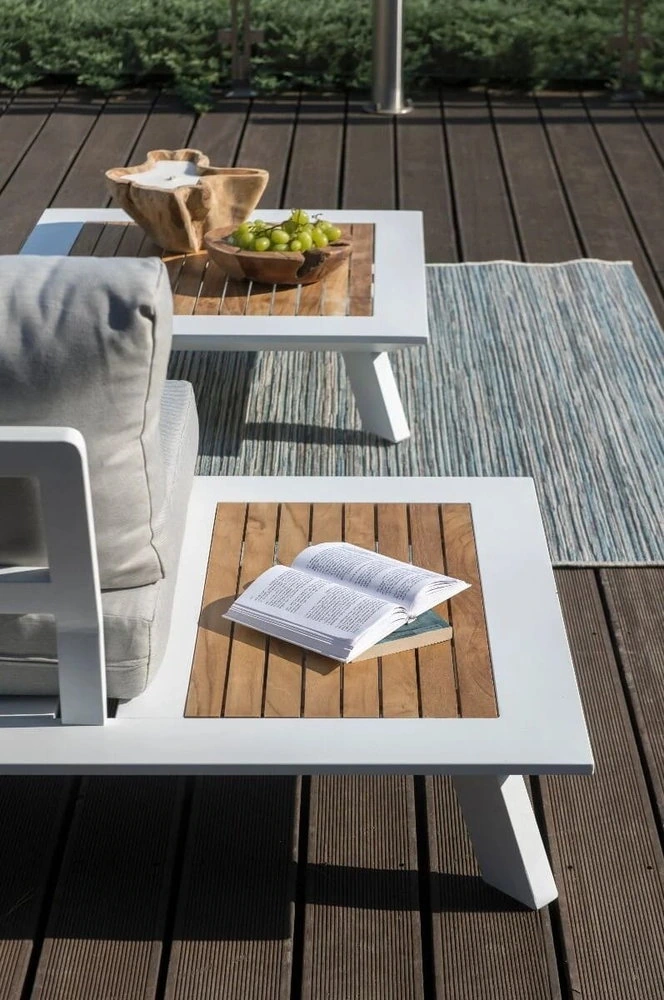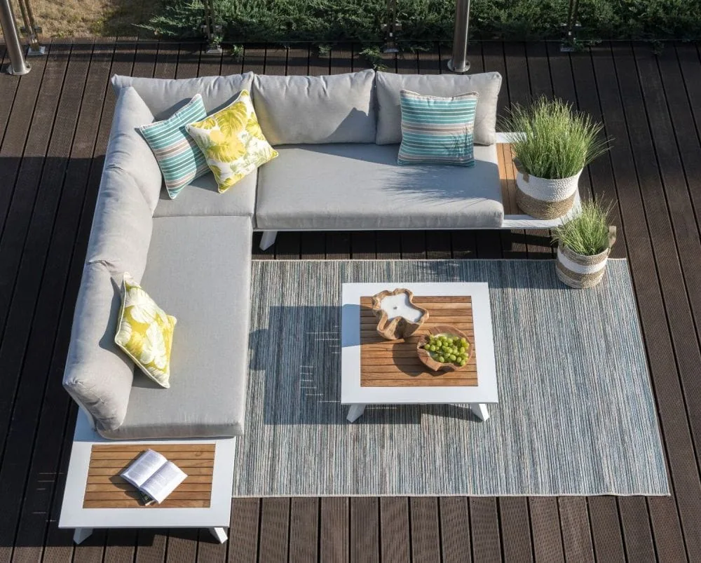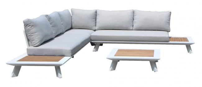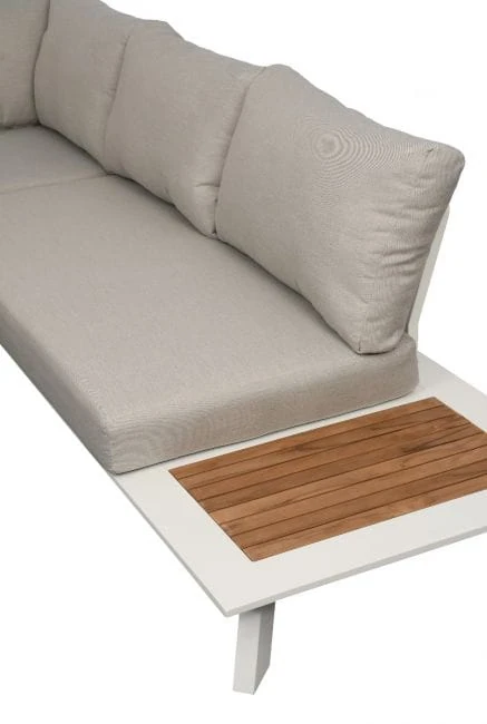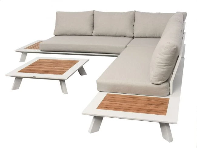 Komplet mebli ogrodowych Berg został wykonany z dbałością o najmniejsze detale. Dzięki czemu prezentuje się bardzo estetycznie i efektownie. Zarówno siedzisko narożnika, jak i oparcie wypełniają beżowe, puszyste poduszki z nowoczesnej Olefiny. Ta tkanina nie pochłania wilgoci oraz nie blaknie pod wpływem promieniowania słonecznego, dlatego też poduszki zachowują nienaganny wygląd na długi czas. Ich wnętrze wypełnia sprężysta pianka tapicerska. Całą konstrukcję podtrzymuje aluminiowy stelaż w białym kolorze, o matowym wykończeniu. Wykorzystany metal cechuje się niepodatnością na duży nacisk, nie ulega korozji oraz nie wymaga impregnacji. W związku z tym stanowi solidną i trwałą podporę dla całego mebla. Wykańczają go dwa boczne stoliczki, z odeskowanym blatem z drewna teak. Gatunek ten, tak jak pozostałe materiały w komplecie mebli ogrodowych Berg, jest przystosowany do użytku zewnętrznego. Dopełnieniem całości jest kwadratowy stolik kawowy, który również posiada ozdobny element z drewna teak, w postaci deskowanego blatu.