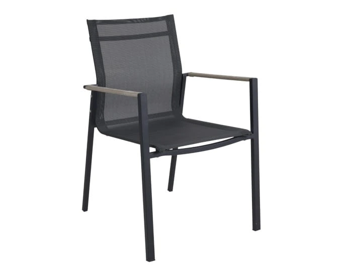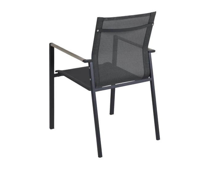 Nowoczesne krzesło czarne Lyra spełni oczekiwania o wygodnym wypoczynku w ogrodzie, zapewniającym komfort siedzenia. Krzesło Lyra wykonane zostało ze stali nierdzewnej 304, idealnie odnajdzie się w stylowych i modnych aranżacjach na tarasie lub balkonie. Nowoczesny i minimalistyczny design jest podkreślony przez wykorzystanie plecionki z tekstyliny, z której wykonano siedzisko wraz z oparciem. Natomiast podłokietniki oplata elegancki technorattan.