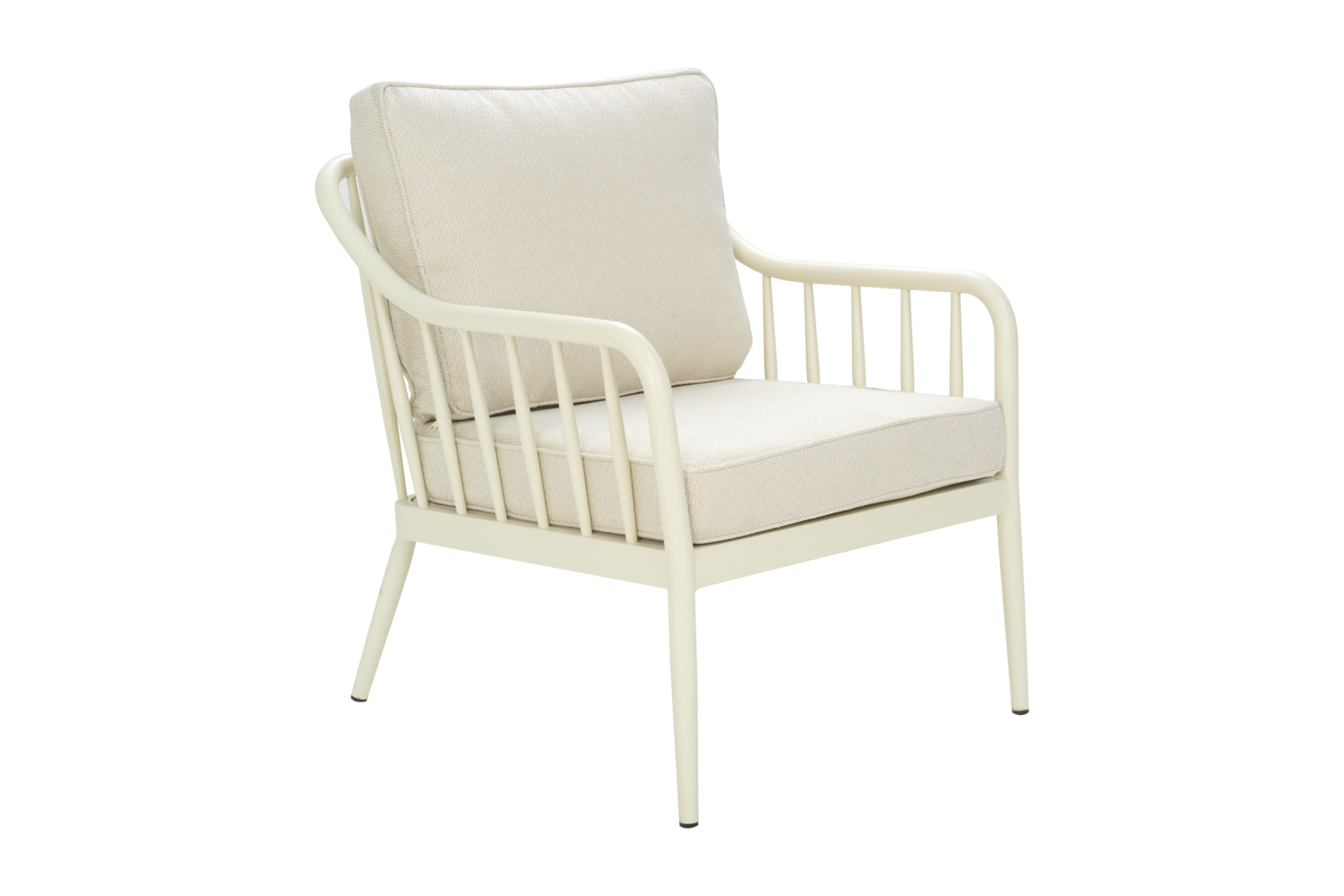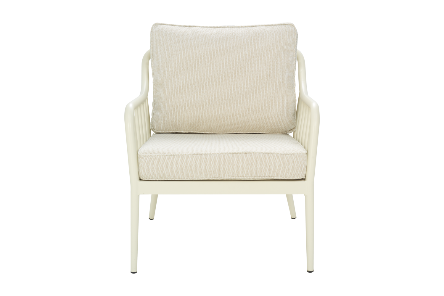 Chociaż przypomina klasyczne fotele drewniane, wykonany jest w całości z aluminium, a poduchy są pokryte olefiną. Aluminium konstrukcji fotela Lens zostało pomalowane proszkowo, dzięki temu odznacza się wysoką odpornością na wilgoć. Metal nie ulega korozji nawet po wielu latach na zewnątrz, więc nie trzeba martwić się o jego pielęgnację czy malowanie, bo tego nie potrzebuje.