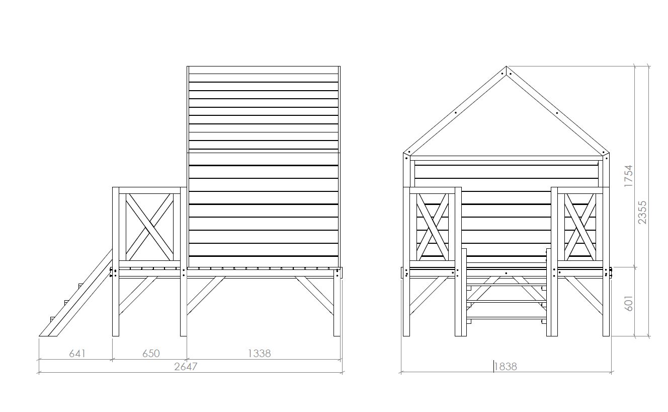 Całkowita podstawa domku wynosi 185x265 cm, ściany wykonane są z desek o profilu 19 mm, dach również z desek o profilu 19 mm. Domek oferowany jest w wersji niemalowanej (z drewna świerkowego surowego, bez impregnacji), dzięki czemu można go samodzielnie pomalować na dowolny kolor. Wewnątrz domku, jedna ścianka jest wykonana z płyty MDF, pokrytej farbą tablicową.