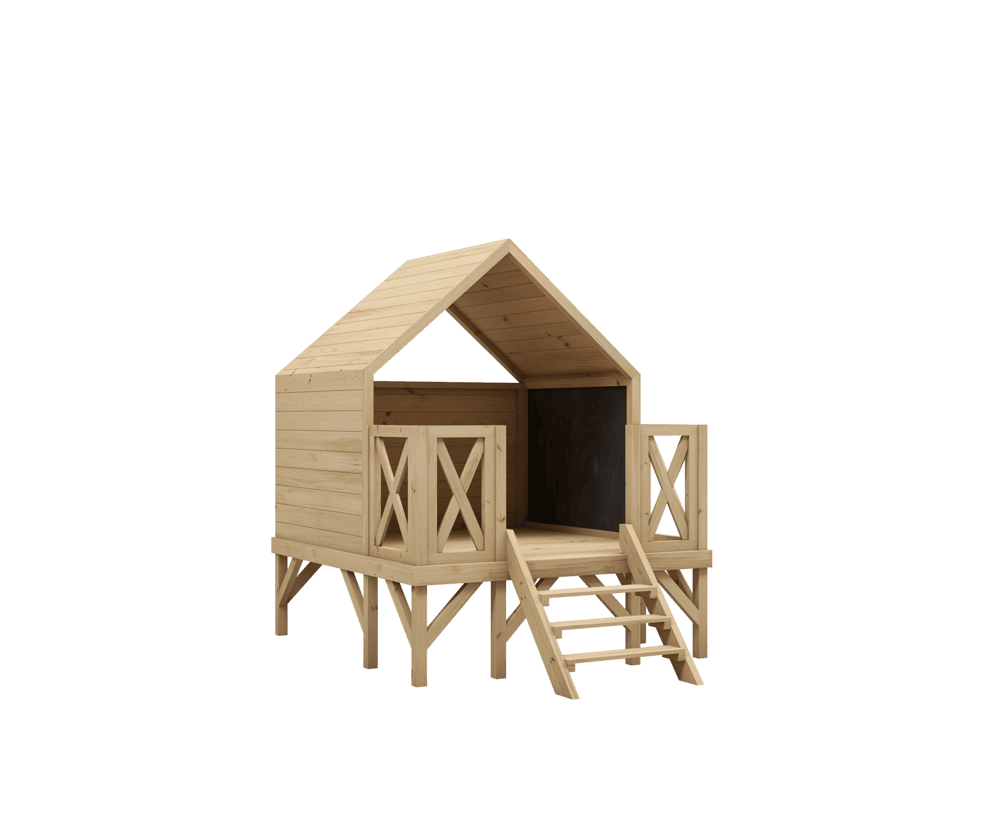 Domek drewniany Floks z podestem do zabawy to doskonały kącik do ogrodu dla małego dziecka. Bezpieczne schodki, taras, przytulne wnętrze i tablica do rysowania. Wewnątrz jest dość miejsca, aby urządzić sobie kącik zabaw, a jedna ze ścianek, pomalowana farbą tablicową.