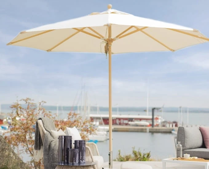 Drewniany parasol ogrodowy o stabilnej konstrukcji z wysokiej jakości drewna. Drewniana konstrukcja nadaje mu elegancki i stylowy charakter. Czasza tego parasola o średnicy 3,5 m zapewnia idealne zacienienie w pożądanym miejscu.