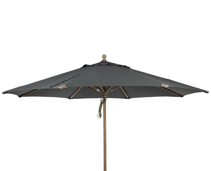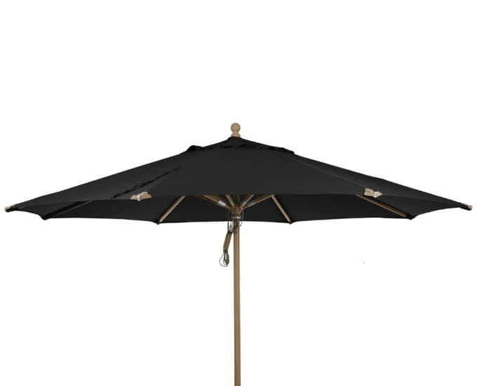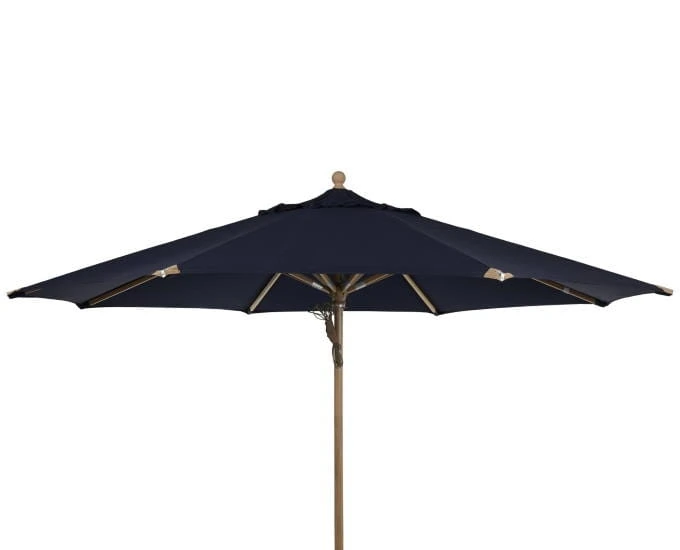 Drewniany parasol ogrodowy został wyposażony w system podwójnego naciągu, który ułatwia rozkładanie parasola. Pokrycie czaszy parasola dostępne jest w pięciu kolorach i dwóch rodzajach materiału-olefiny i impregnowanego poliestru o wadze 410gr/m2.