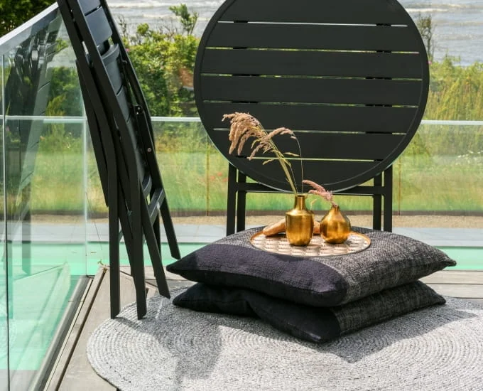 Duża poduszka dekoracyjna Ombrone (60x60) to sporych rozmiarów dodatek do wielu zewnętrznych aranżacji. Wyróżnia się na tle pozostałych elementów dekoracyjnych swoim dwukolorowym designem. Dzięki temu jest niepowtarzalna i nie da się jej nie zauważyć. Dopełnia przestrzeń i podkreśla jej charakter.
