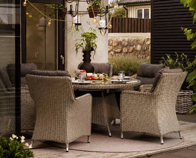 Stół ogrodowy Hornbrook to propozycja dla osób, które gustują w ponadczasowych meblach. Jego okrągły kształt sprawia, że wszyscy biesiadnicy doskonale się widzą i mogą czynnie uczestniczyć w dyskusji. W zależności od wybranego rozmiaru, do stołu przysiąść się może od dwóch do sześciu osób.