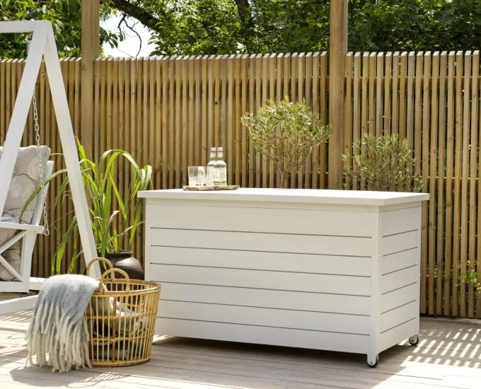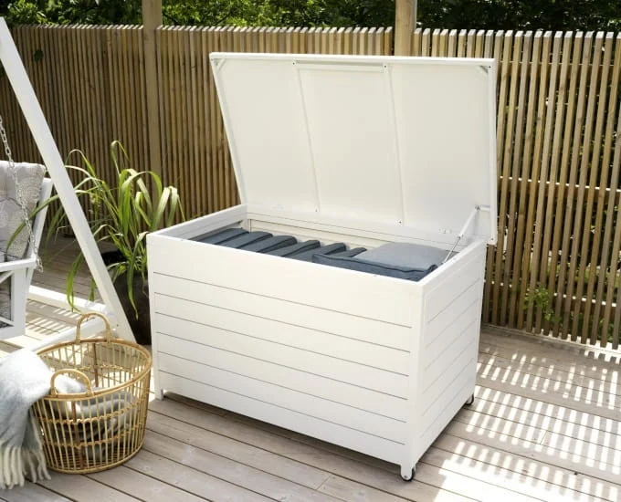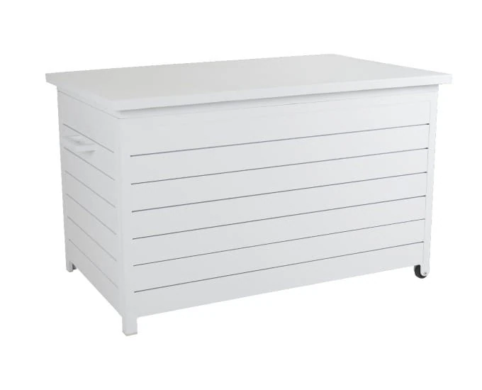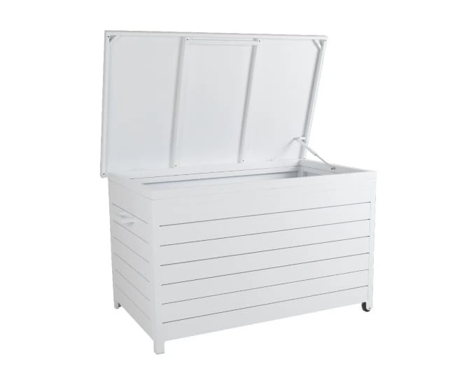 Skrzynia doskonale pasuje do mebli aluminiowych i będzie przydatnym pojemnikiem na przechowywanie poduszek, które ochroni przed wilgocią i kurzem.