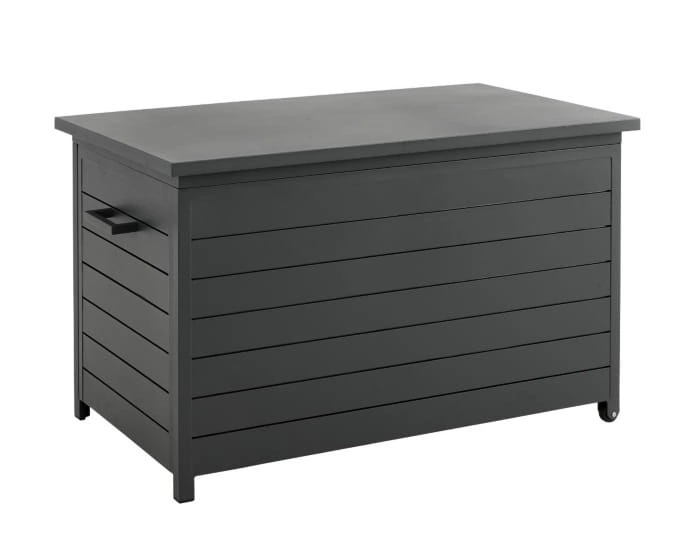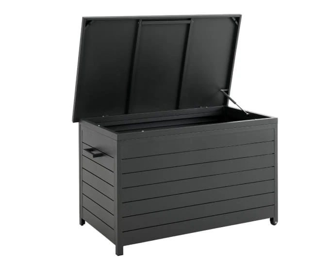 Mała skrzynia Bellac wyposażona jest w nieduże kółka oraz wygodny uchwyt, ułatwiające jej przesuwanie. Wieko skrzyni jest wyposażone we wsporniki, podtrzymujące je, gdy jest otwarte. Obudowa skrzyni imituje drewniane listewki, co nadaje szyku całej konstrukcji. Matowy odcień skrzyni, będzie współgrał ze wszystkimi meblami aluminiowymi.