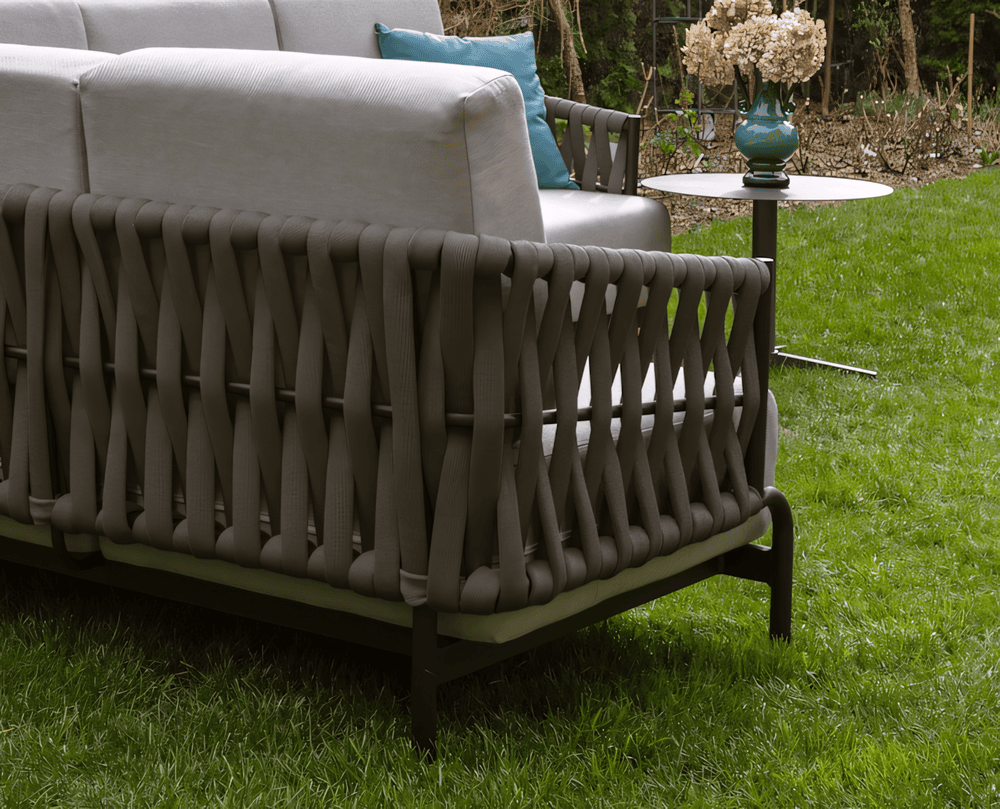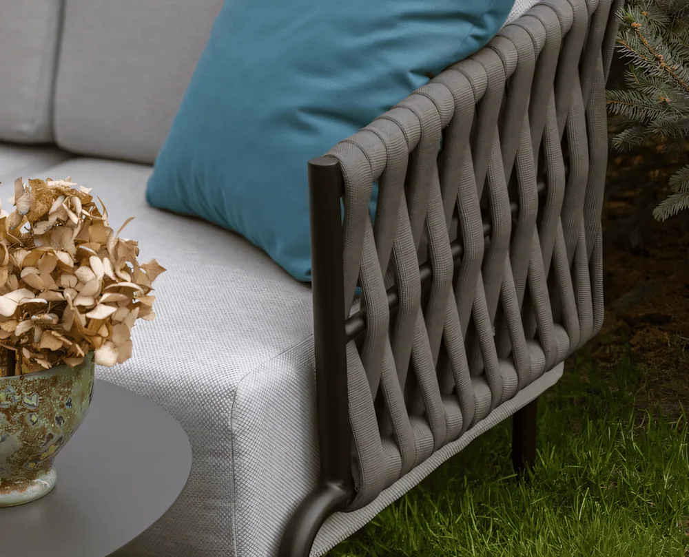 Nowoczesny narożnik tarasowy Casablanca, łączy elegancję z funkcjonalnością. Jego czarna aluminiowa konstrukcja doskonale komponuje się z wodoodpornym sznurem outdoorowym, a grube i wygodne poduchy z szarej olefiny, zapewnią komfort podczas wielu wyjątkowych chwil spędzonych na tarasie.