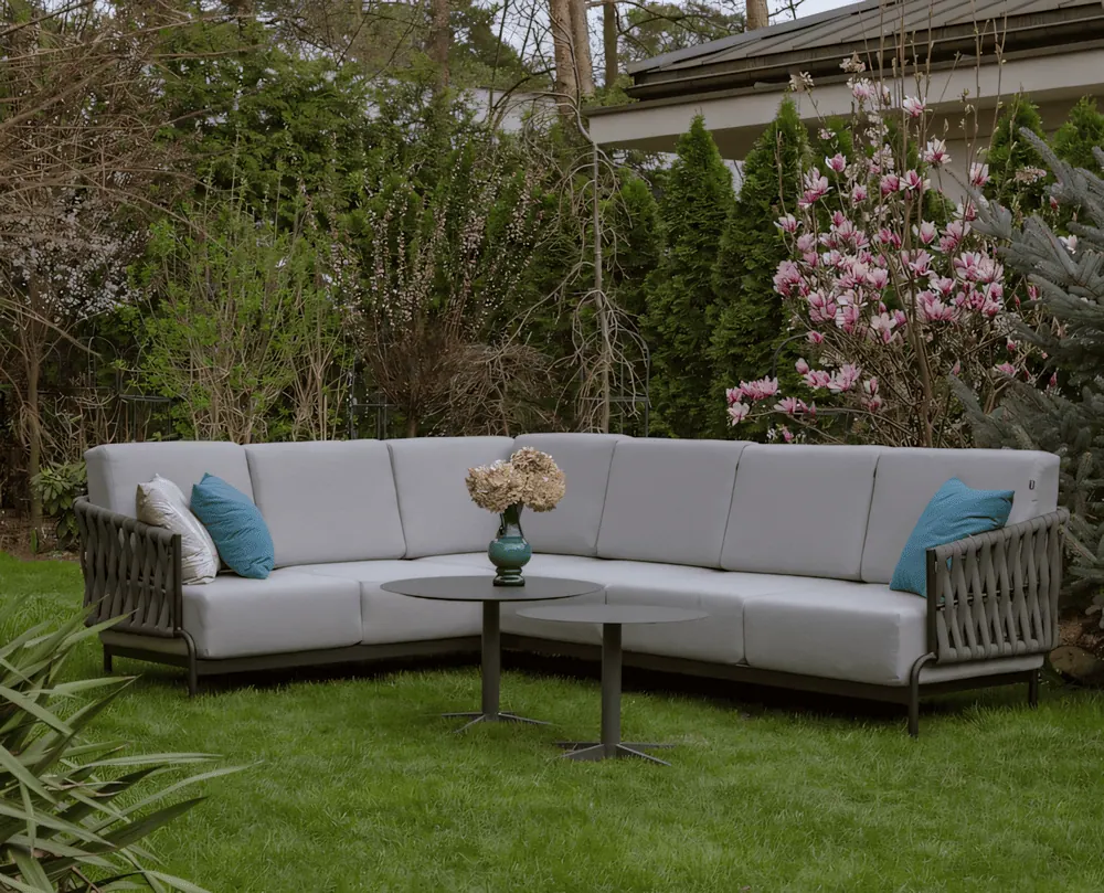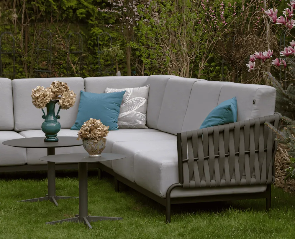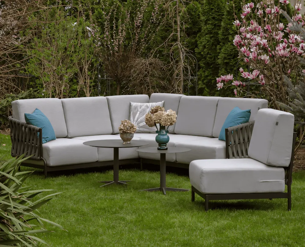 Nowoczesny narożnik wykonany jest z trwałej aluminiowej ramy, która gwarantuje długowieczność mebla. Materiał pokrywający poduchy - olefina, cechuje się odpornością na warunki atmosferyczne oraz łatwością w czyszczeniu. Dodatkowy moduł środkowy pozwala na elastyczność w aranżacji, umożliwiając rozbudowę narożnika lub utworzenie wolnostojącego siedziska.