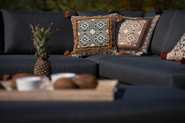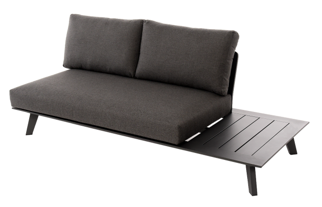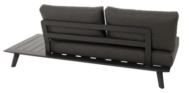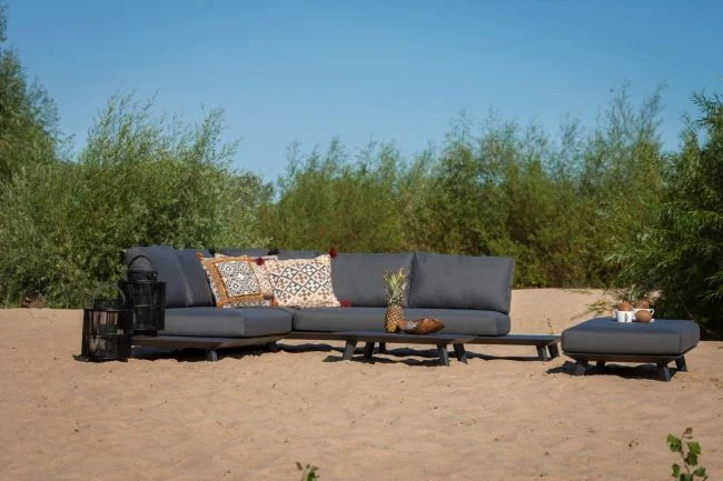 Modułowa sofa została wyposażona w aluminiowy stelaż. Metal ten nie koroduje i jest odporny na uszkodzenia i obciążenie, dlatego też stanowi trwałą konstrukcję dla całości. Siedziska oraz oparcia wyścielają duże poduszki z dralonu, czyli postępowej tkaniny, która nie pochłania wilgoci i jest łatwa w utrzymaniu w czystości. W całej swojej okazałości sofa jest niezwykle estetyczna i praktyczna, a wykorzystane materiały o podwyższonej odporności sprawiają, że można z niej korzystać na tarasie oraz w ogrodzie.