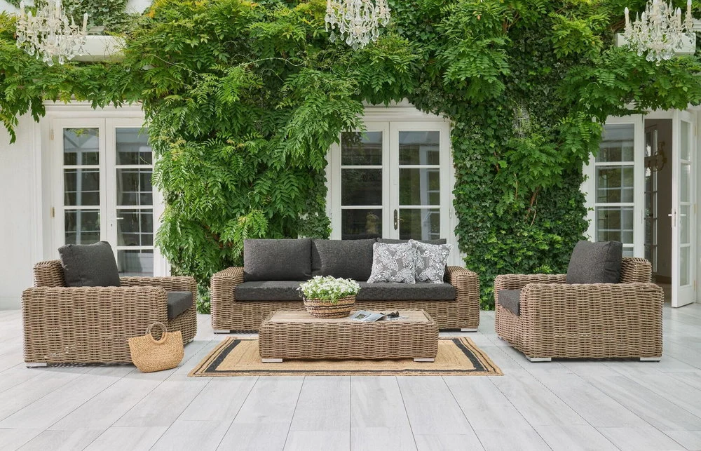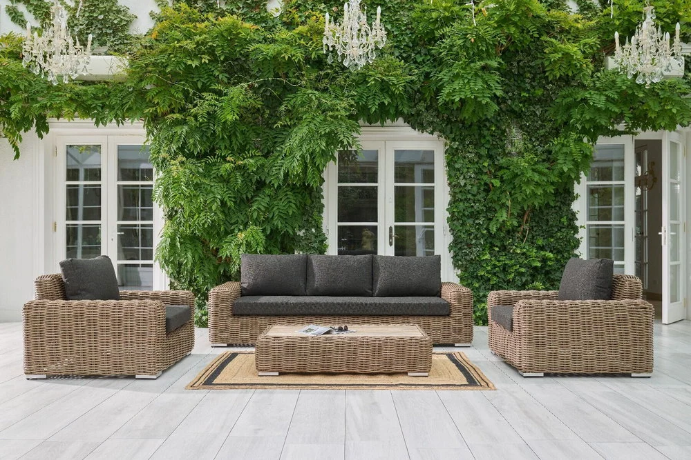 Fotel Maje Natural wypełniają czarne, puszyste poduszki, które doskonale harmonizują z ciemnym tłem konstrukcji. Pokrywa je postępowa tkanina sunproof, niepodatna na promieniowanie UV.