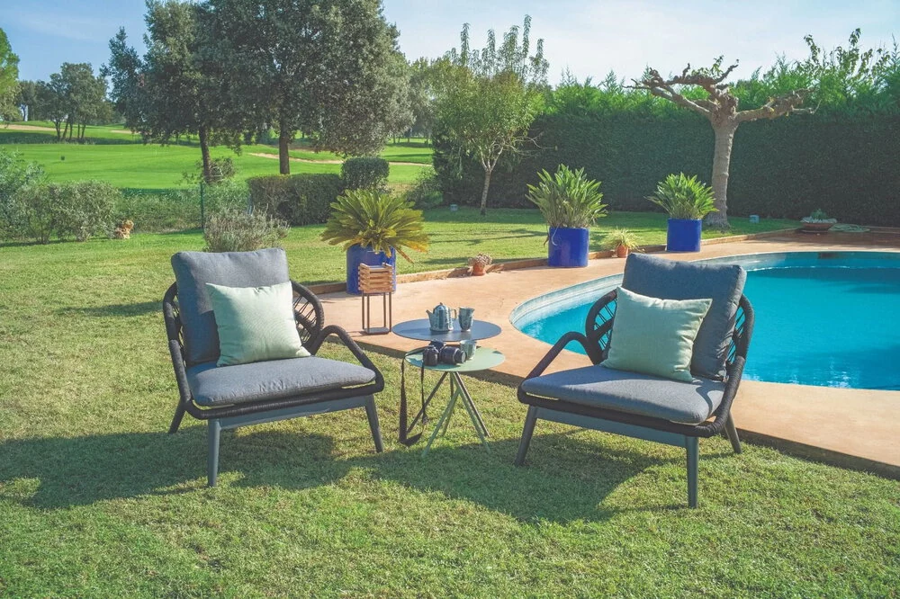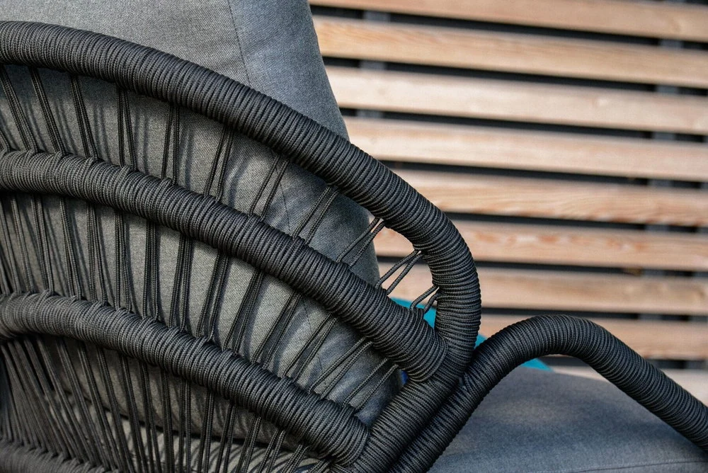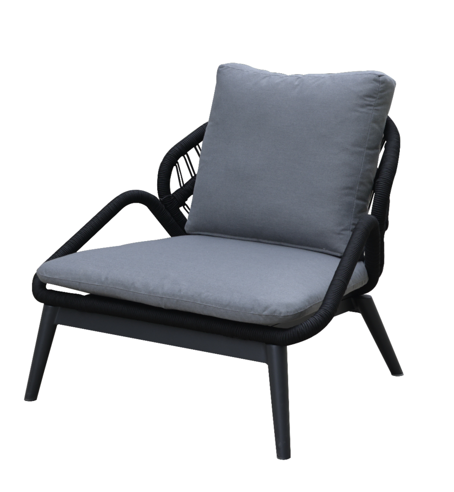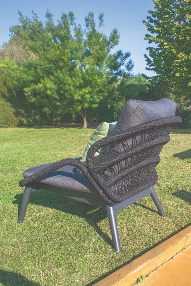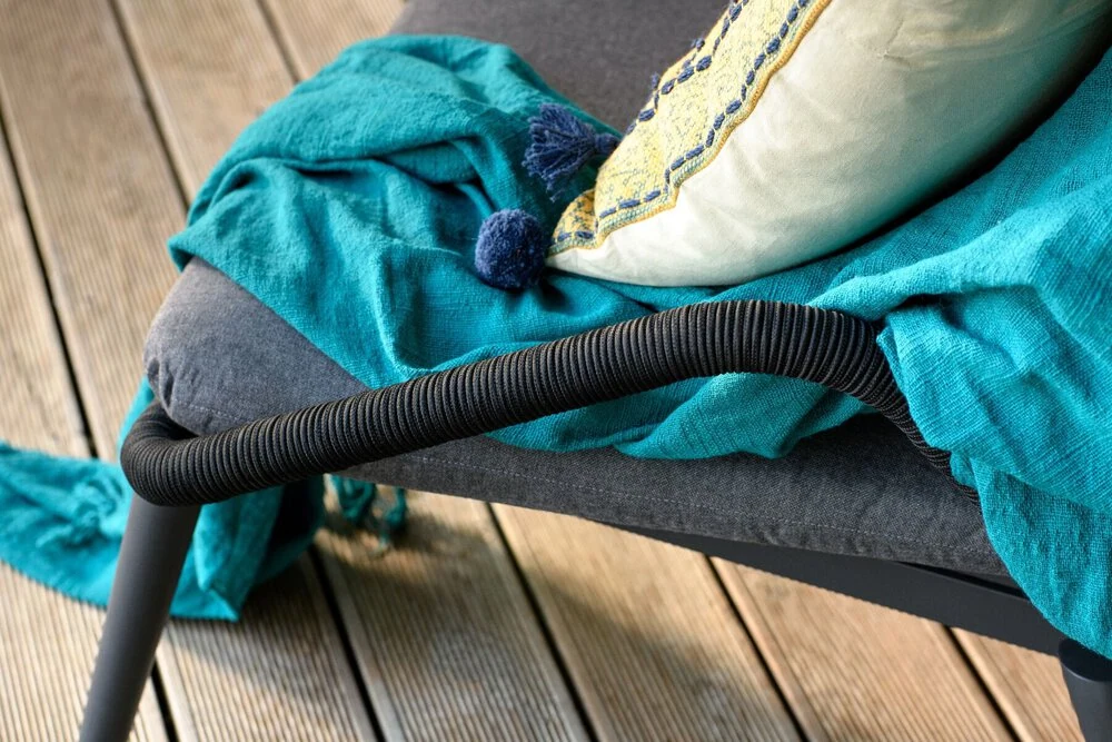Fotel wypoczynkowy Lamego podtrzymuje solidna aluminiowa konstrukcja. Pokrywa ją powłoka grafitowej farby, stanowiąca dodatkową warstwę zabezpieczającą metal. Dzięki czemu jest odporna na negatywny wpływ warunków atmosferycznych, takich jak wilgoć, zmienna temperatura, czy promieniowanie słoneczne. Siedzisko wypełniają puszyste poduszki, dzięki którym wypoczynek jest jeszcze przyjemniejszy. Ergonomiczne oparcie, dostosowane do naturalnej pozycji ciała człowieka - dodatkowo oplatają aplikacje ze sznurka. Nadają one lekkości i wyróżniają mebel spośród innych modeli tego typu. Stonowana kolorystyka w odcieniach szarości, umożliwia zestawienie mebla z wieloma dodatkami.