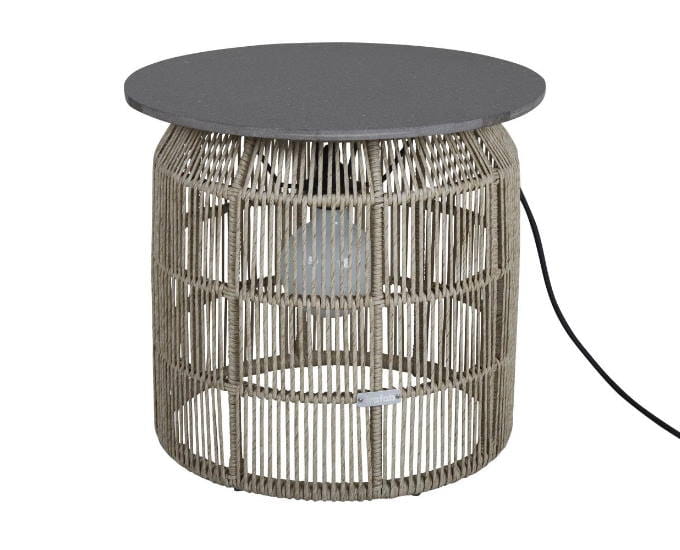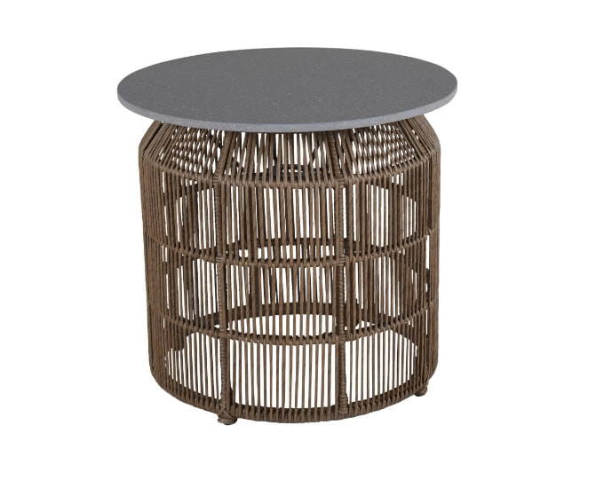 Nowoczesny design stolika jest widoczny, dzięki zastosowaniu jako blatu betonu. Beton jest unikatowy i bardzo trwały, dzięki połączeniu go z włóknem szklanym. Podstawę stanowi pleciony technorattan, który ma kształt wypukłego walca.