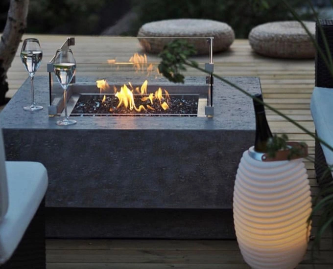 Palenisko wykonane jest z lekkiego betonu z włóknem szklanym, co zapewnia jego odporność na działanie promieni UV oraz trwałość na różne warunki atmosferyczne. Jego konstrukcja pełni także funkcję stolika, na który można odstawić kieliszek i przekąskę. Ogień osłonięty jest szybą przed wiatrem i ewentualnym jego dotknięciem.