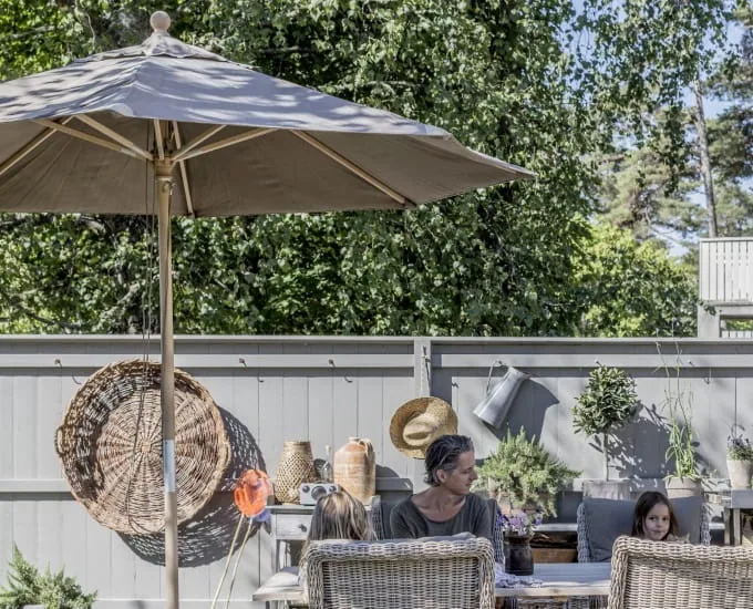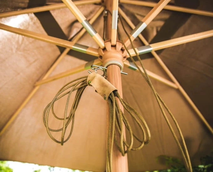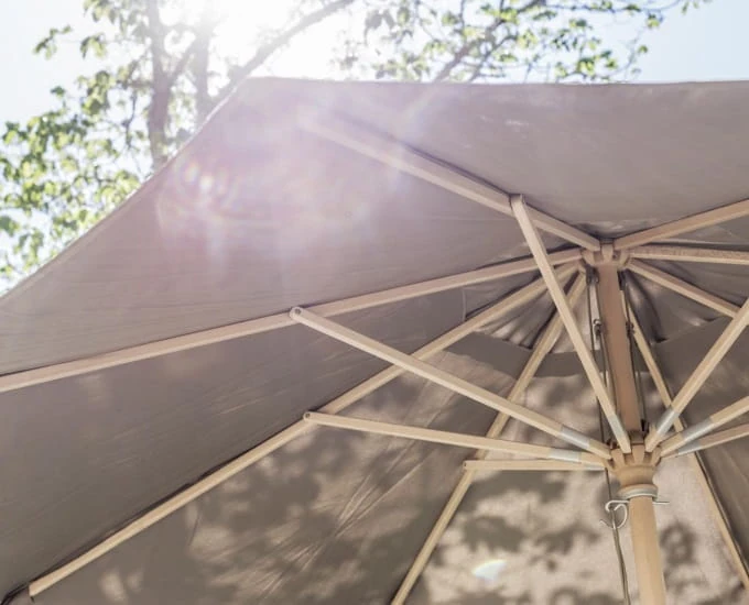 Parasol ogrodowy Reggio o średnicy czaszy 300 cm to elegancja i trwałość przede wszystkim. Czasza parasola zachwyca skórzanymi wzmocnieniami, a konstrukcja z drewna bukowego, lakierowanego, prezentuje się naturalnie i stylowo. Parasol Reggio został wykonany na dwuczęściowym trzonku, dzięki czemu jest on bardziej stabilny i wytrzymały, łatwiej również w ten sposób go przechować czy szybko rozkręcić do schowania. Splot z poliestru o gramaturze 250g gwarantuje również odporność na uszkodzenia, przerwanie czy wytarcie.