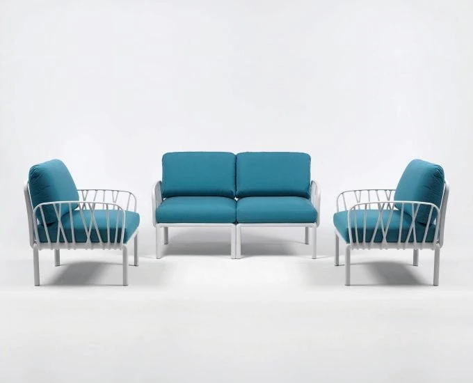 Sofa Komodo jest dostępna w kilku modnych kolorach konstrukcji i poduszek. Poduszki wczepiane są w siedzisko i oparcie sofy, dzięki czemu nie przesuwają się i są zawsze na właściwym miejscu. Sofa Komodo polecana jest w szczególności do kawiarni, hoteli i pensjonatów, gdzie będzie doskonałym meblem na taras, patio czy w ogrodzie.