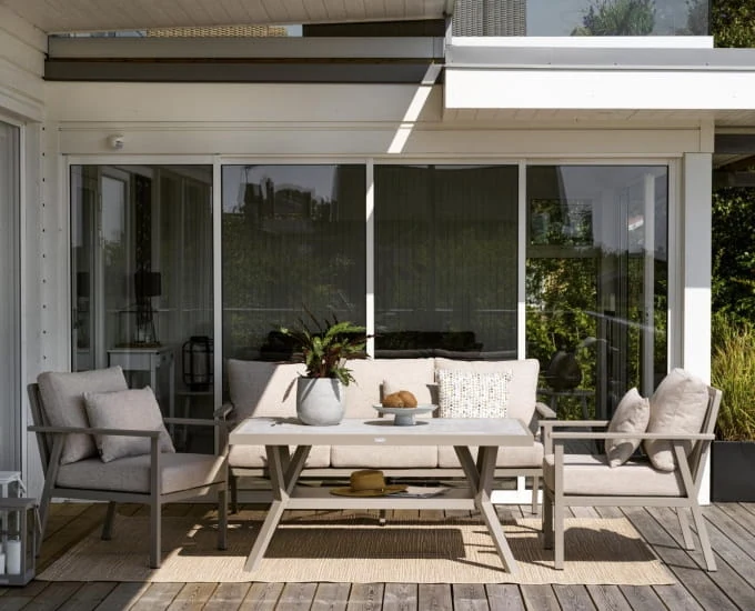 Wypoczynkowa sofa Samvaro na taras nie ma sobie równych! Jest pojemna, komfortowa, wykonana z wysokiej jakości materiałów i dopracowana w detalach. Sofa wykonana jest z aluminium, w dwóch wersjach kolorystycznych do wyboru. Siedzisko wypełniają dwie duże poduchy z wysoce wodoodpornej olefiny, podobnie jak oparcia również wyposażone w dwie grube poduchy. Głębokość sofy pozwala na to, aby wygodnie się na niej rozsiąść, czy ułożyć w pozycji półleżącej, a nawet aby uciąć sobie drzemkę.