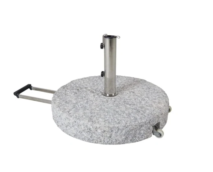 Bardzo stabilna, solidna i pięknie wykonana podstawa pod parasol. Jest nie tylko praktyczna, ale także doskonale sprawdzi się w otoczeniu, gdzie nie będzie przytłaczać. Okrągła podstawa została wykonana z jasnego granitu, naturalnego kamienia, w nieoszlifowanej formie. Chropowata powierzchnia kamienia jest naturalnie piękna. Podstawa ma wagę 70 kg i dzięki temu jest jedną z najbardziej trwałych i stabilnych podstaw pod parasol. Polecana jest do parasoli na nodze środkowej, umieszczonej pośrodku czaszy. Części metalowe wykonano ze stali nierdzewnej, przez co nie są one narażone na korozję i mogą mieć kontakt z wilgocią i wodą. Dla ułatwienia przesuwania, podstawę wyposażono w kółka oraz rączkę.