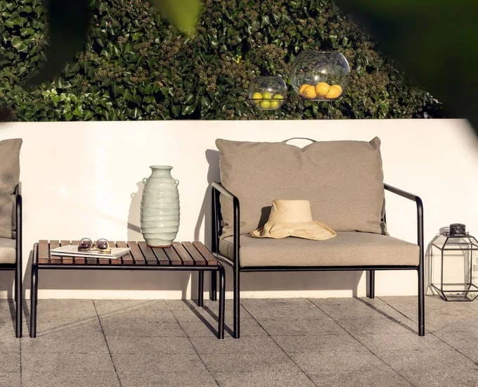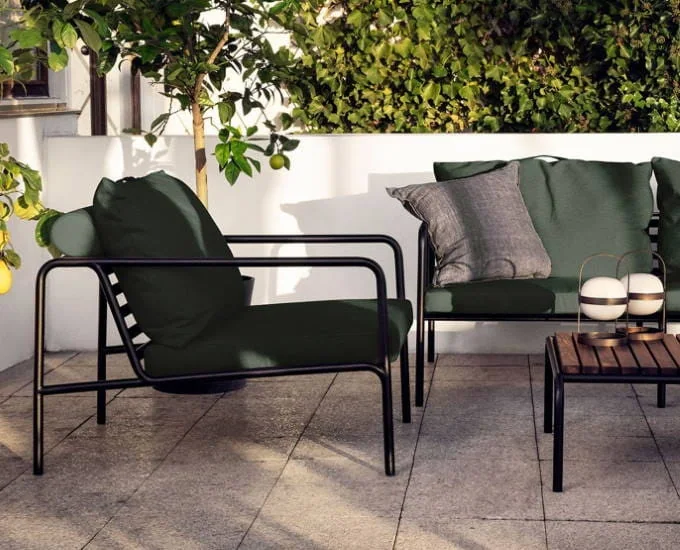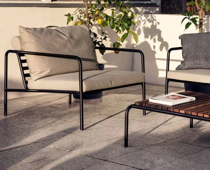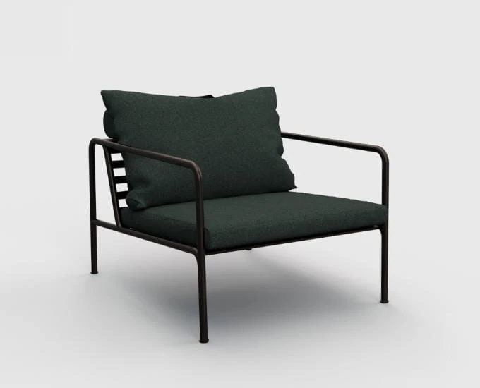 Stalowy fotel Avon wyścielają duże, miękkie poduszki. Pokrywa je wodoodporna tkanina Sunbrella Heritage, niepodatna na zabrudzenia oraz niekorzystne czynniki atmosferyczne. Na jej powierzchni nie rozwijają się grzyby i pleśń, dlatego też jest bezpieczna podczas użytkowania, nawet dla osób cierpiących na alergie. Sunbrella jest również odporna na promieniowanie słoneczne, w związku z tym nie traci pierwotnego koloru, nawet podczas intensywnej eksploatacji na zewnątrz. Sunbrella Heritage zawiera 50% recyklingowanych włókien akrylowych.