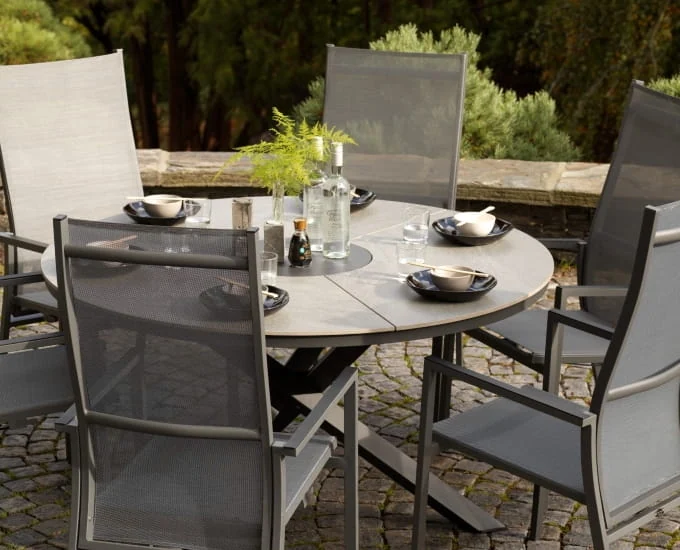 Stół Kenora z ceramicznym blatem, dzięki swojej prostocie wpisze się w wymagającą przestrzeń ogrodu oraz tarasu. Zastosowane trwałe materiały pozwalają na korzystanie z niego przez długi czas. Jest efektowny oraz funkcjonalny, stanie się nieodzownym elementem wielu spotkań towarzyskich na tarasie czy w ogrodzie.