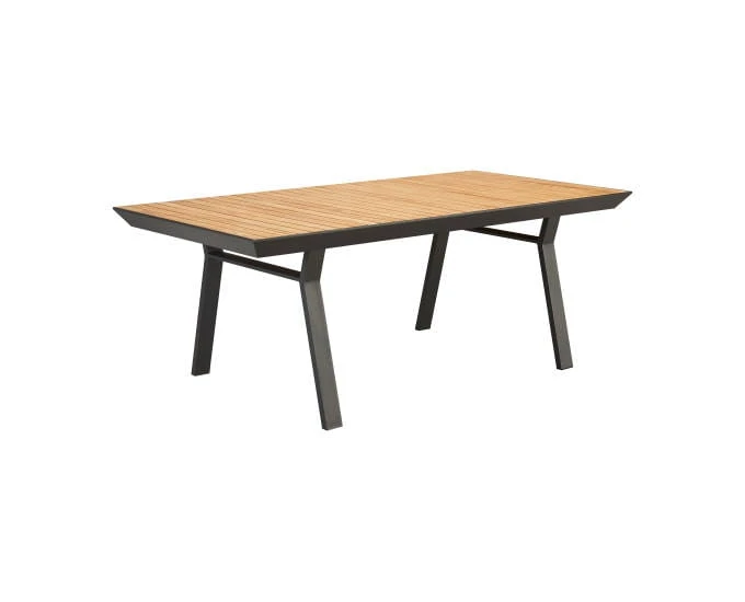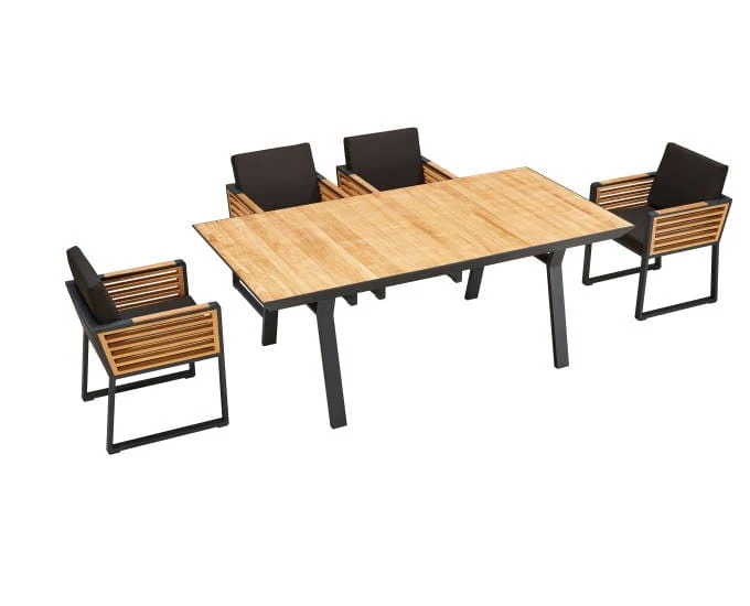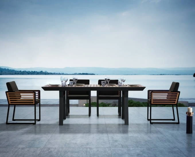 Stylowy zestaw mebli jadalnianych New York zawiera duży stół oraz sześć komfortowych krzeseł. Stół posiada prostokątny kształt oraz niespotykaną konstrukcję. Podtrzymuje ona efektowny blat, wykonany z egzotycznego drewna teak. Połać drewna na stole nadaje mu charakteru oraz podkreśla wyjątkowość mebla. Teak jest bardzo często wykorzystywany w produkcji wyposażenia zewnętrznego, ze względu na swoje właściwości. Przede wszystkim wykazuje się wysoką odpornością na wahania temperatury, wilgoć oraz promieniowanie słoneczne. Nie wymaga także impregnacji i jest bezproblemowy podczas użytkowania. Drewno teakowe jest nasączone naturalnymi substancjami oleistymi, przez co zachowuje odpowiedni poziom nawilżenia.