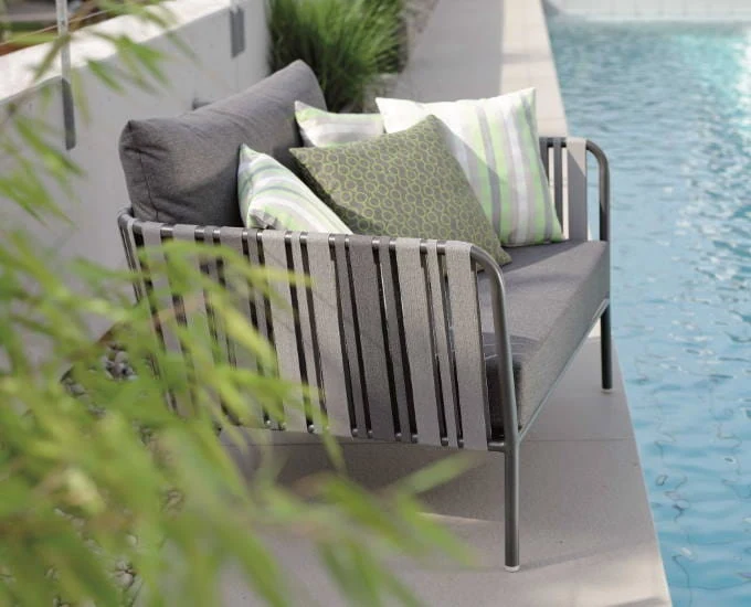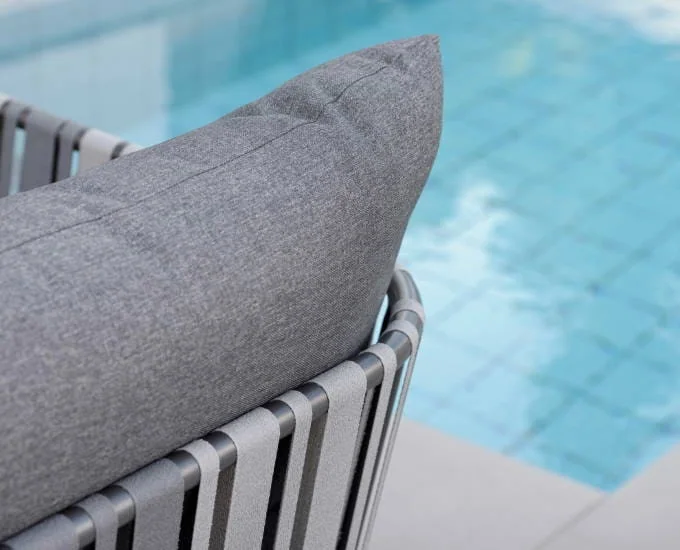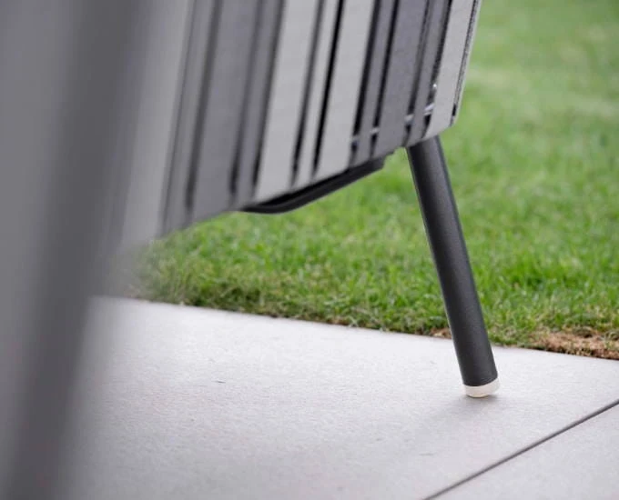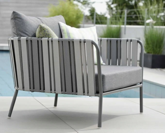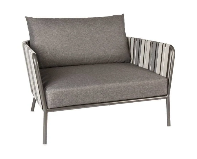 Szeroki fotel ogrodowy Space wypełniają podłokietniki z elementami pasów z tekstyliny w odcieniach szarości oraz grafitu, co spełnia dodatkową funkcję dekoracyjną.