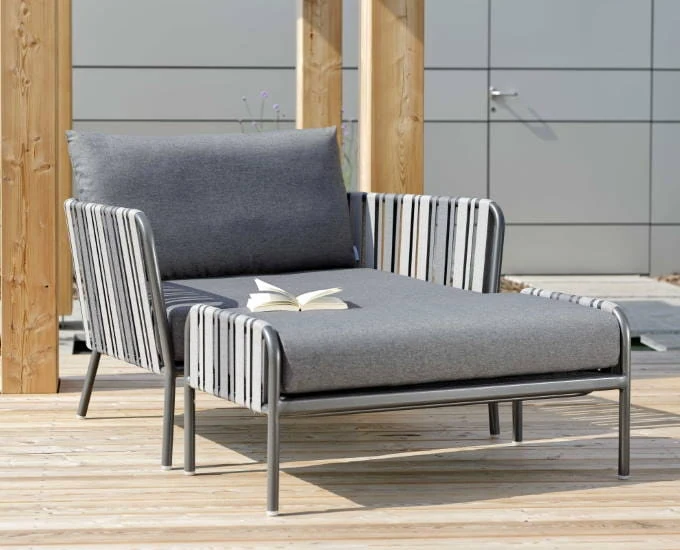 Szeroki fotel ogrodowy Space szary jest kompatybilny z podnóżkiem z kolekcji Space, dostępnym również w naszej ofercie.