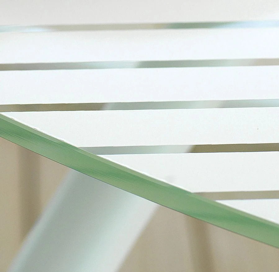 Szklany blat to szkło hartowane o grubości 10 mm, bardzo odporne na uszkodzenia. Konstrukcja blatu wygląda wyjątkowo, ponieważ pasy naniesione na jego powierzchni, nadają lekkości, a półprzezroczysta powierzchnia ładnie komponuje się z otoczeniem. Szklany blatjest bardzo odporny na czynniki atmosferyczne - nie ulega wilgoci ani nasłonecznieniu, a także ogromną zaletę stanowi łatwa pielęgnacja szkła - nie przyjmuje ono zanieczyszczeń i kurzu, a wystarczy mycie go wodą z dodatkiem płynu do naczyń.