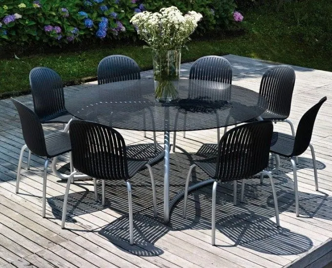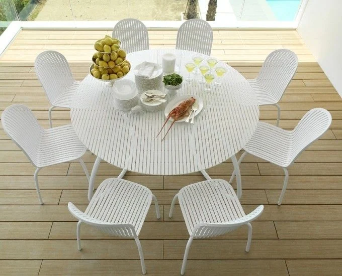 Okrągły szklany stół Loto Dinner dla 8 osób, to wyjątkowa konstrukcja łącząca szkło hartowane i aluminium. Stół ma okrągły blat, a dostępny jest w 2 wersjach kolorystycznych. Stół sprawdzi się zarówno we wnętrzach, jak też ogrodzie. Nowoczesna, oryginalna forma i wykonanie stołu zapewnia, że będzie można poczuć się w ogrodzie niczym w salonie.