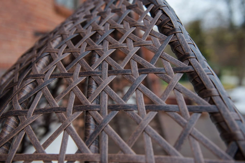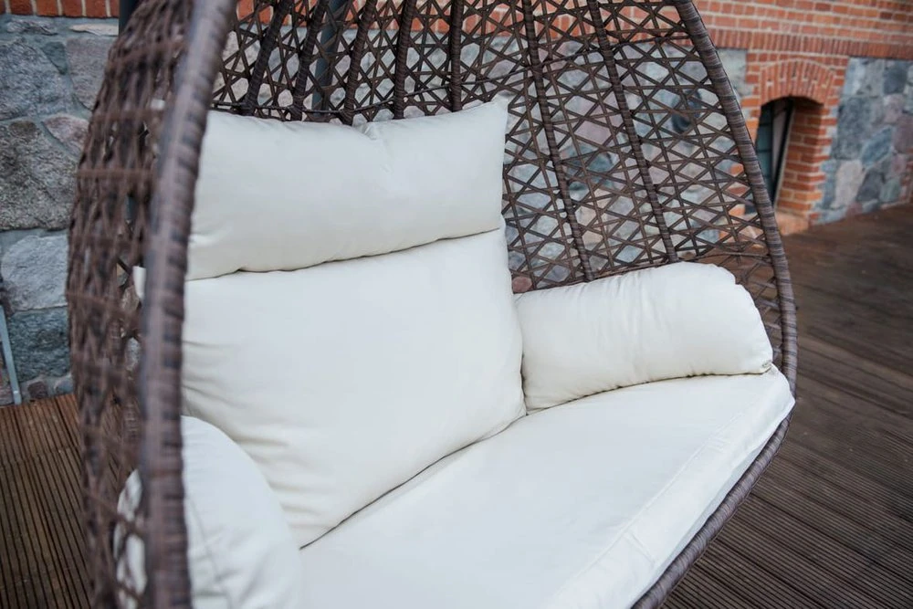 Charakterystycznym elementem fotela jest 2-osobowe siedzisko w formie ażurowego kosza. Zostało wyplecione ręcznie z trwałego technorattanu. Wykorzystany materiał jest niepodatny na rozciąganie oraz deformację. Dodatkowo jest odporny na zmienną temperaturę, wilgoć oraz promieniowanie. Sprawia to, że mebel zachowuje swój wygląd i właściwości, mimo przebywania w niekorzystnym środowisku. Wnętrze kosza wypełniają pikowane poduszki w kolorze ecru, które doskonale prezentują się na tle brązowej plecionki. Podwyższają one komfort wypoczynku oraz nadają całości stylu i charakteru.