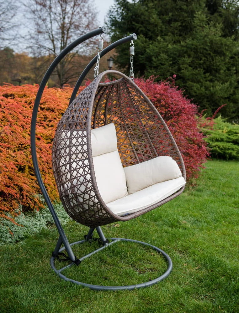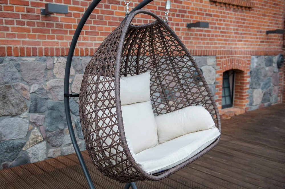 Wiszący fotel 2-osobowy Doppio z technorattanu nie wymaga montażu oraz czynności związanych z impregnacją, dzięki czemu jest bezproblemowy i prosty w użytkowaniu. Neutralna kolorystyka, pozwala na wkomponowanie go w dowolną przestrzeń.