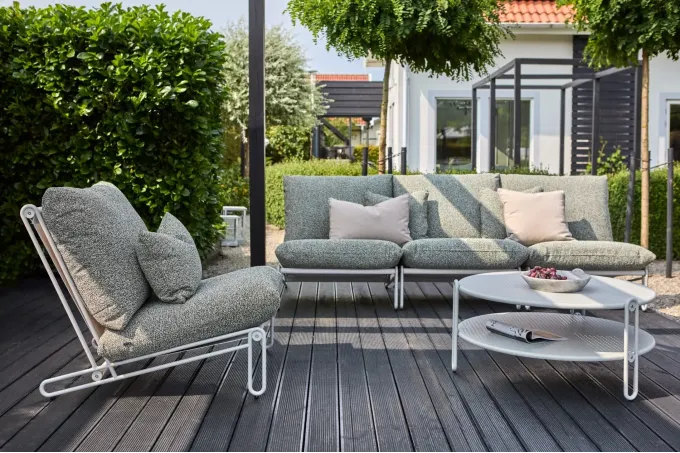 Siedzisko oraz oparcie sofy ogrodowej Blixt wypełniają miękkie poduchy w kolorze zielonym. Dzięki temu ostateczny wygląd mebla dostosować można do własnego gustu i innych dodatków, tworząc tym samym spójną całość. Poduchy wykonane są z nowoczesnej i modnej tkaniny boucle.