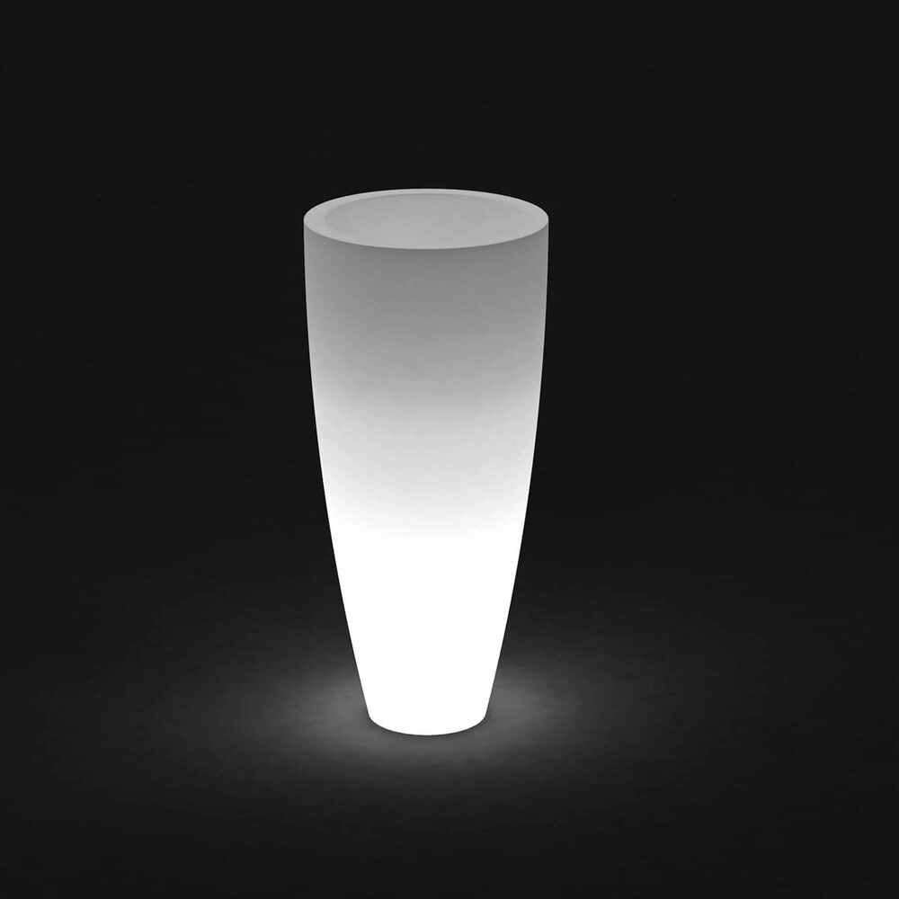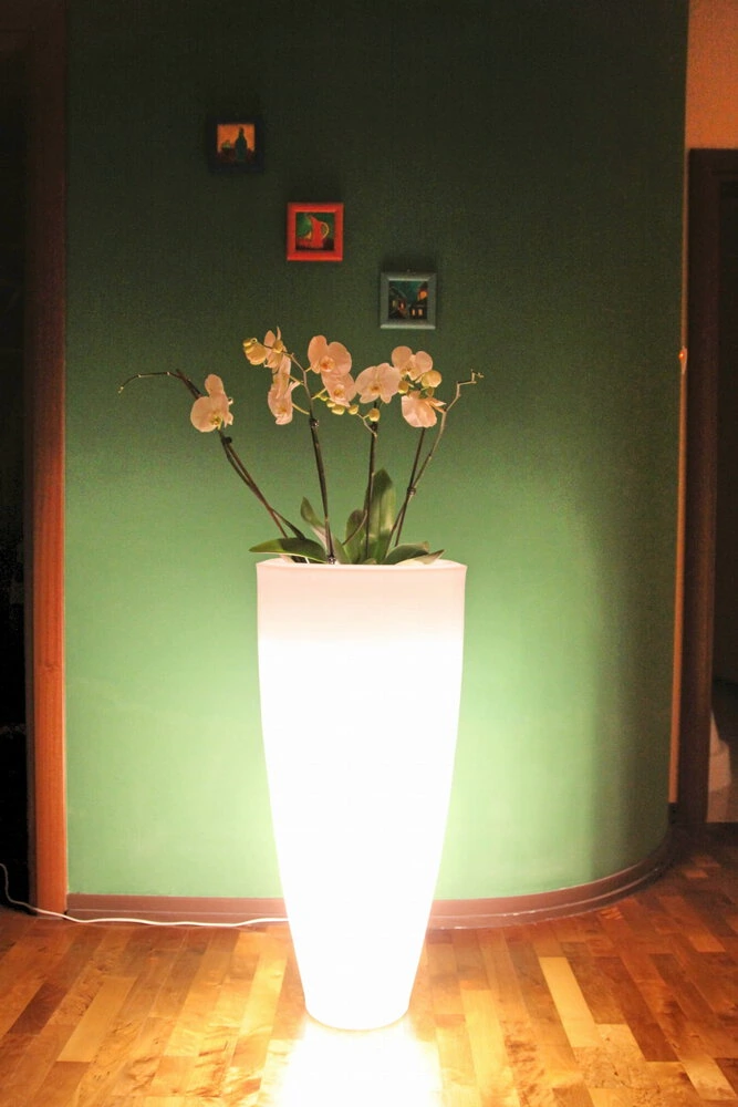 Wysoka donica Kalypso posiada specjalną półkę, dzielącą dno na dwa poziomy. Jest ona umieszczona na wysokości ok. ⅓ bryły. Dzięki temu nie ma konieczności wypełniania jej w całości ziemią, przez co donica jest lżejsza i łatwiejsza w przestawianiu. Dodatkowy element stanowioświetlenie LIGHT ze świetlówką LED lub RGB z zmiennym światłem, które wprowadza niezwykle klimatyczną atmosferę.