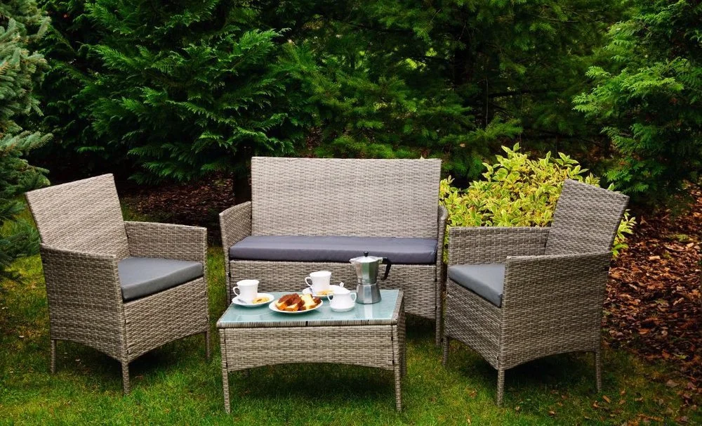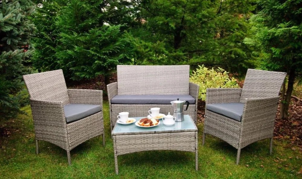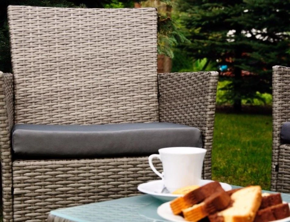 Fotele i sofa mają wysokie, wyprofilowane oparcia i podłokietniki, które dodatkowo uprzyjemniają wypoczynek. Stolik kawowy wyposażono w blat ze szkła bezpiecznego, dzięki czemu czyszczenie go nie jest trudne. Okruszki, kurz, czy pyłki nie dostają się pomiędzy gęstą plecionkę, z gładkiego blatu łatwo jest je usunąć.