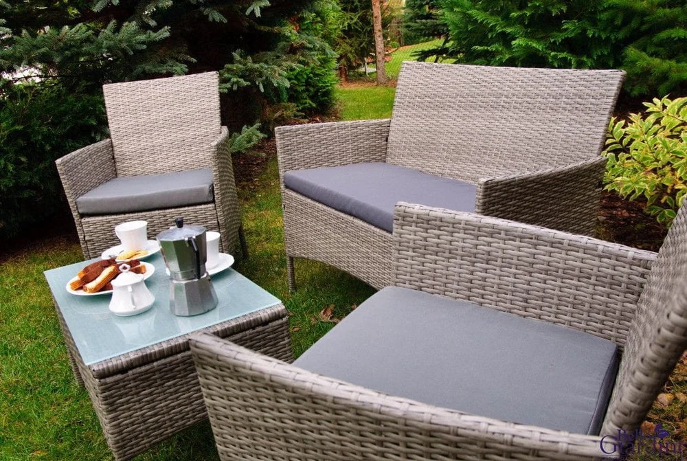 Piękny komplet mebli ogrodowych Dritto jest idealny na taras czy do innej części ogrodu, gdzie chciałoby się stworzyć wymarzoną strefę wypoczynku. Komplet składa się z sofy, dwóch foteli oraz stolika kawowego. W zestawie także wysokiej jakości poduchy na siedziska, co dodatkowo zwiększa wygodę wypoczynku z zestawem Dritto.