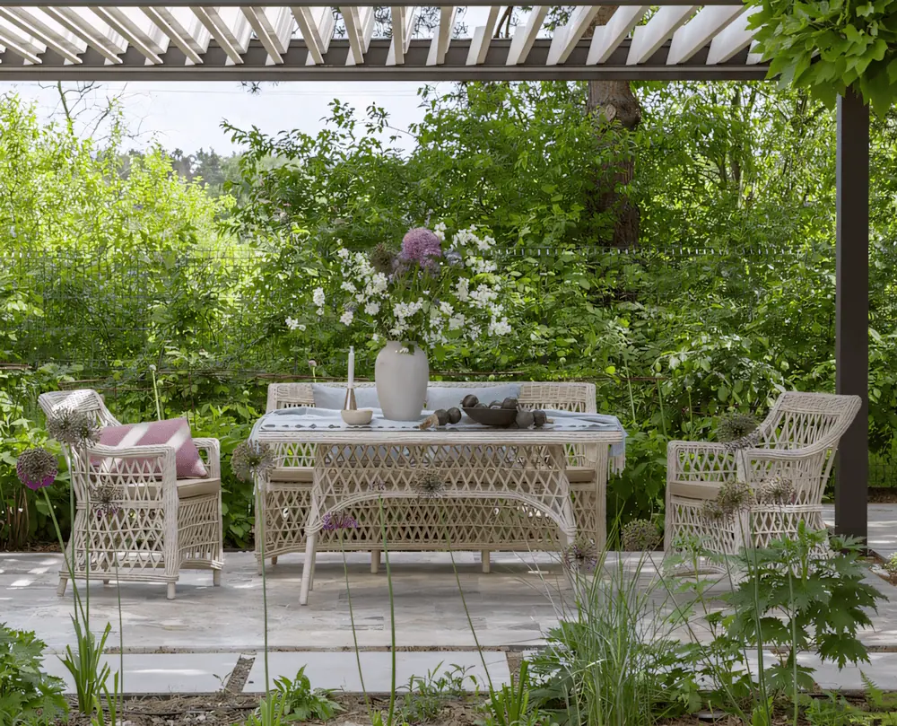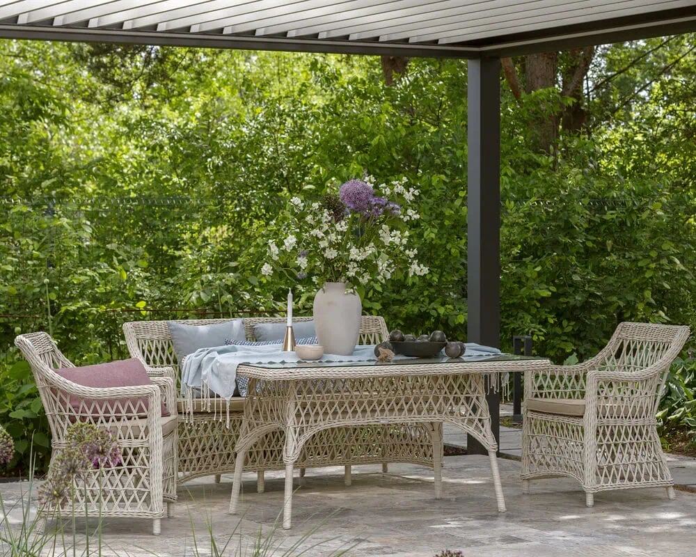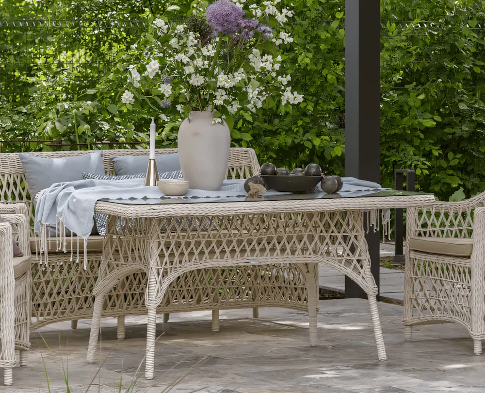 Zestaw ogrodowy Orleans jadalniany, pozwoli na stworzenie przytulnej jadalni na tarasie na świeżym powietrzu. Komplet składa się z dużej sofy 3-osobowej oraz dwóch foteli i stołu. To zestaw w sam raz dla 4-osobowej rodziny, a kolejne dwie osoby można zmieścić przy stole, dostawiając fotele.