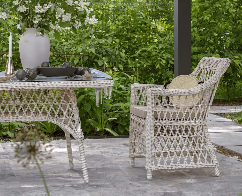 Zestaw Orleans stylistycznie wpisuje się w styl francuski, prowansalski i angielski. Meble mają ażurowy wzór, a ich wykonanie z biało-szarego technorattanu, kojarzy się z bieloną wikliną. Dzięki temu meble ogrodowe Orleans wyglądają jak wyjęte z dawnych ogrodów, gdzie mogłyby stać na werandzie, patio czy po prostu na trawniku wśród zieleni.